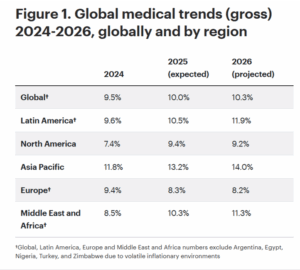 L’inflation médicale globale est projetée à +10% en 2026 (TW report 2026). L‘inflation médicale globale se distingue bien entendu de l’inflation des biens de consommation courante. Retrouvez tous les rapports disponibles sur cette page, pour aller dans le détail.